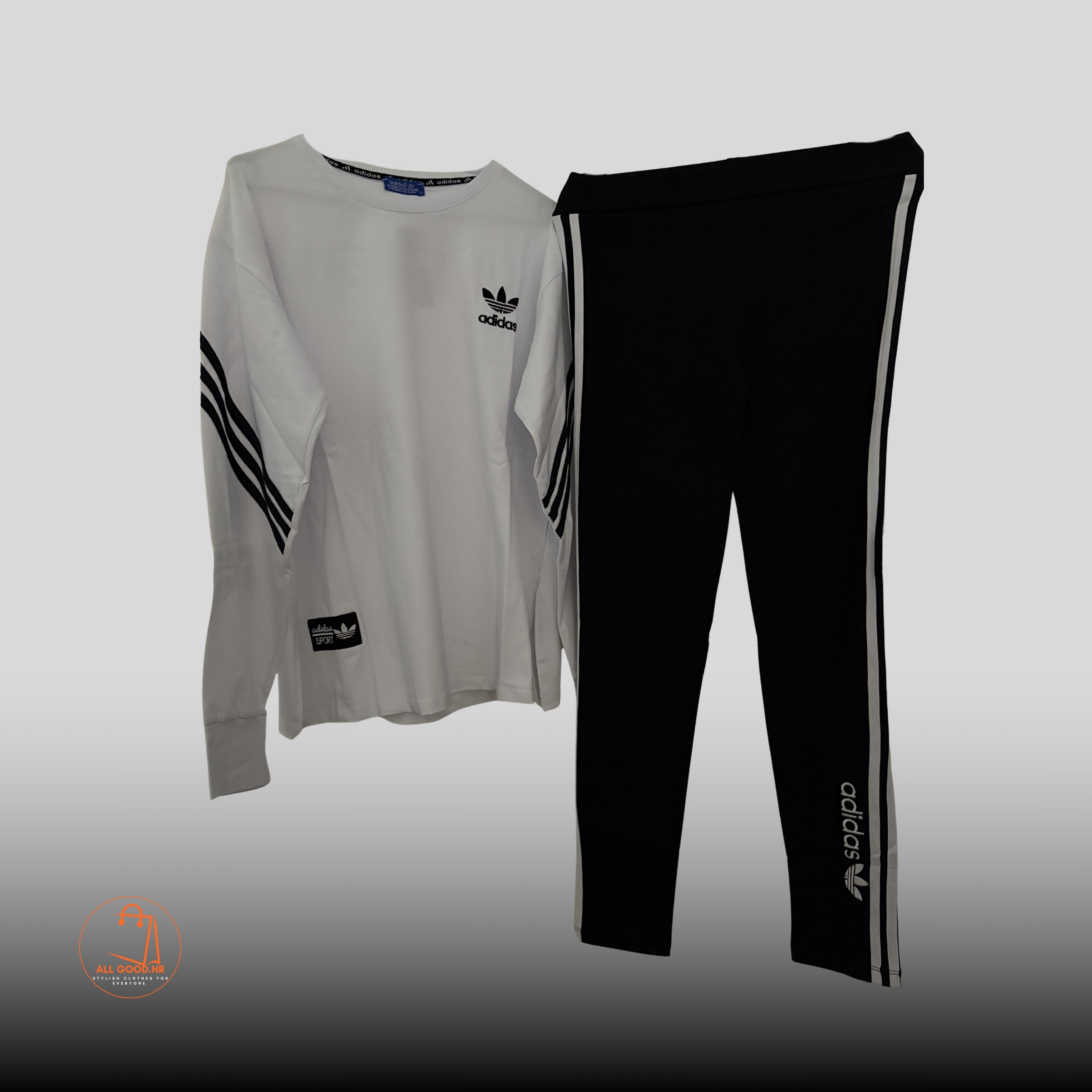 Sportski komplet koji uključuje bijelu majicu dugih rukava i crne tajice s bijelim crtama. Lagani materijal, idealan za rekreaciju ili ležerne kombinacije. Logo na prsima i nogavicama pruža prepoznatljiv sportski stil.