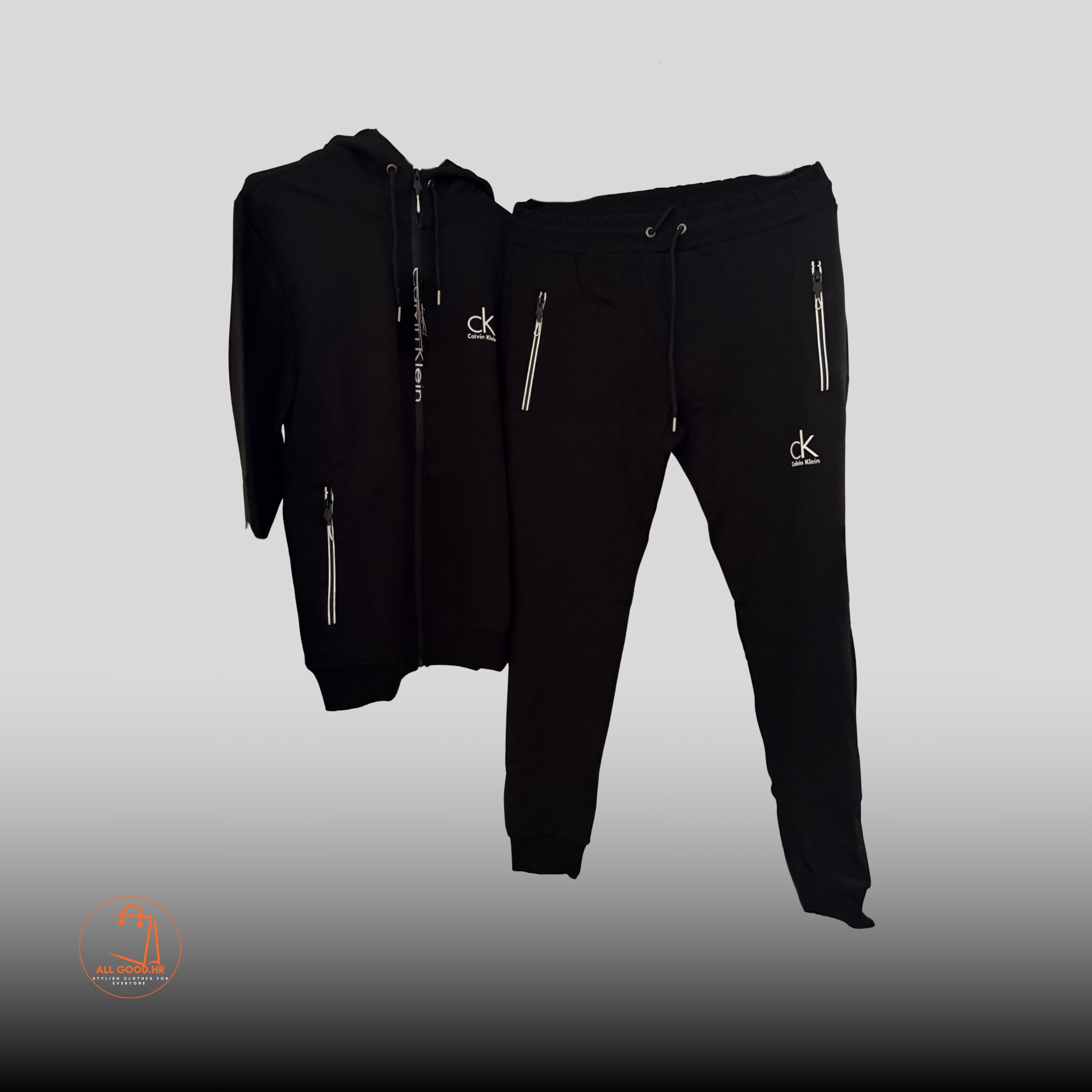 Crna CK trenirka s patentnim zatvaračima i minimalističkim logom. Moderna silueta i funkcionalan dizajn za one koji cijene udobnost i stil.