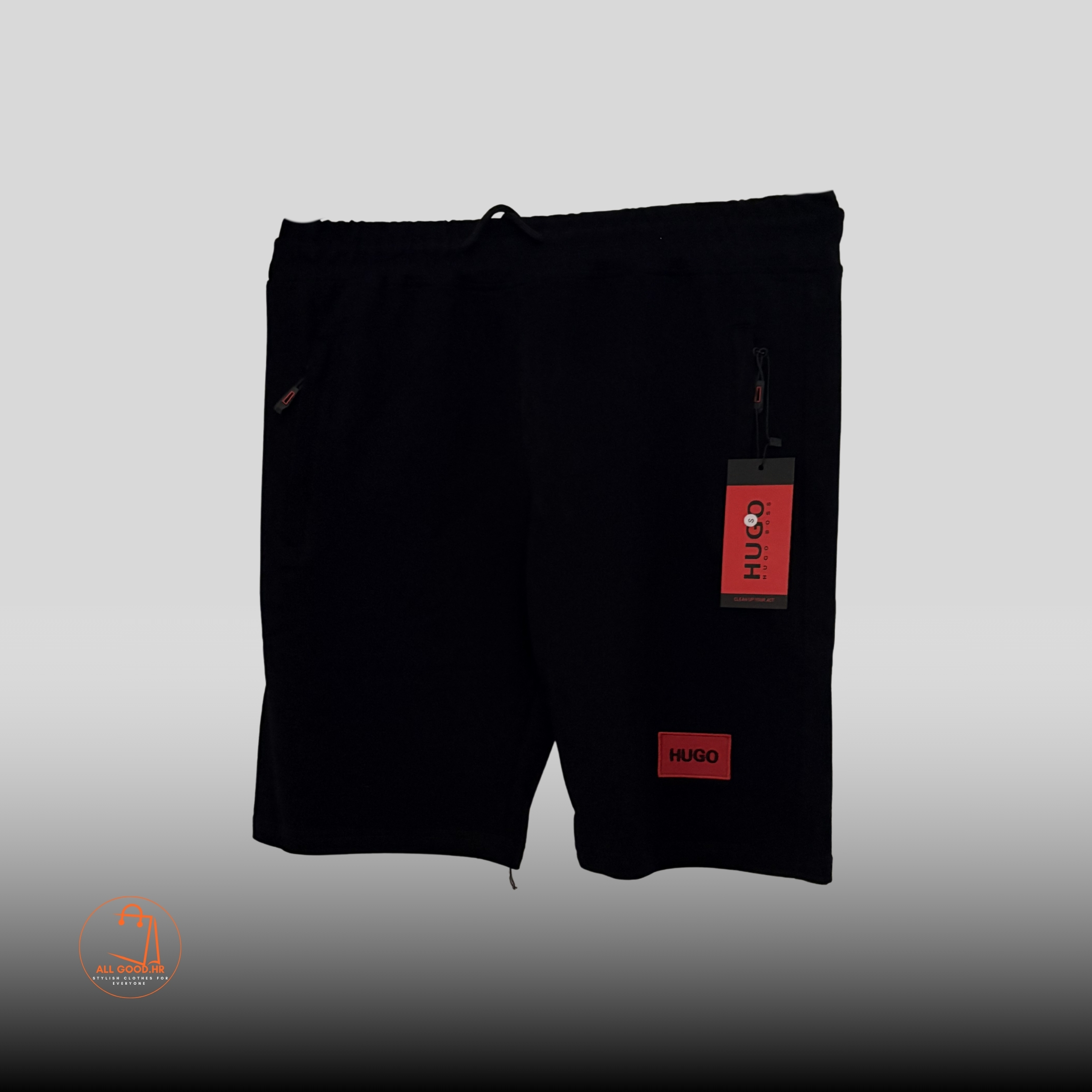 Jednostavne, ali efektne muške hlače iz Hugo kolekcije. Crna podloga s upečatljivim crvenim Hugo logom, bočni džepovi s patentom i elastični pojas za maksimalnu udobnost.