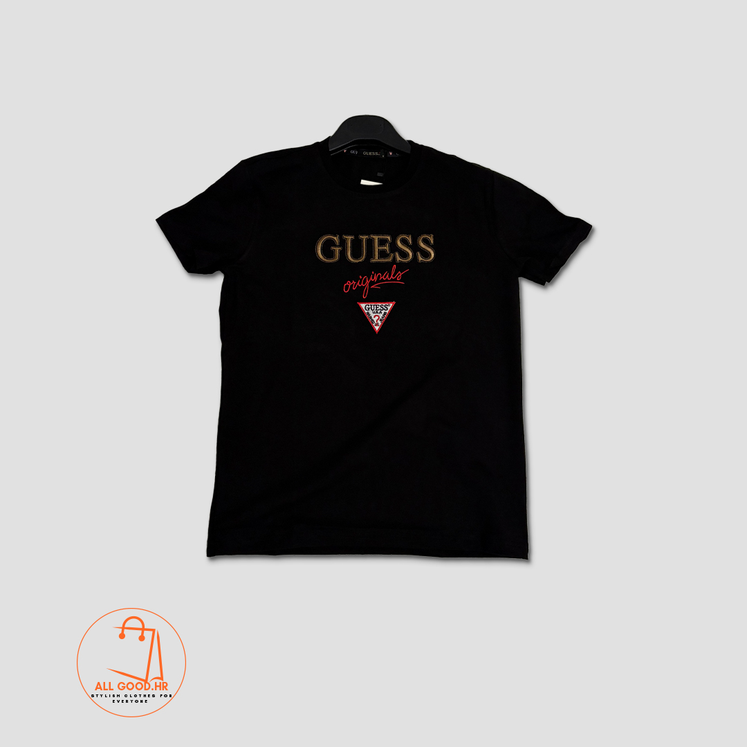 Crna muška majica s upadljivim Guess natpisom i trokut logom na sredini. Kombinacija stilskog izgleda i udobnosti za ležerne kombinacije.