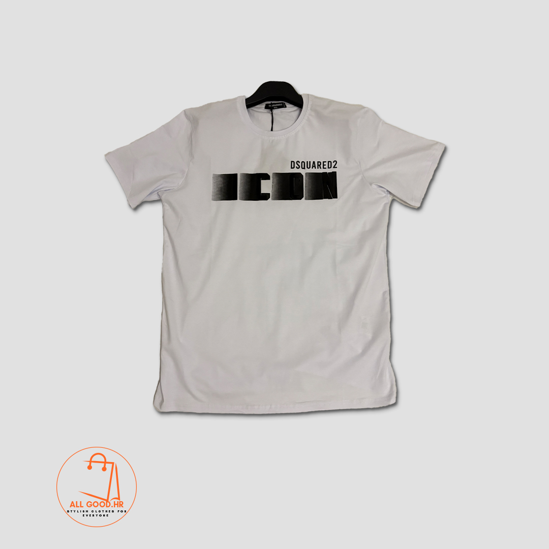 Bijela verzija poznate Dsquared2 ICON majice s istaknutim crnim printom. Savršena za one koji vole statement komade u svijetlim bojama.