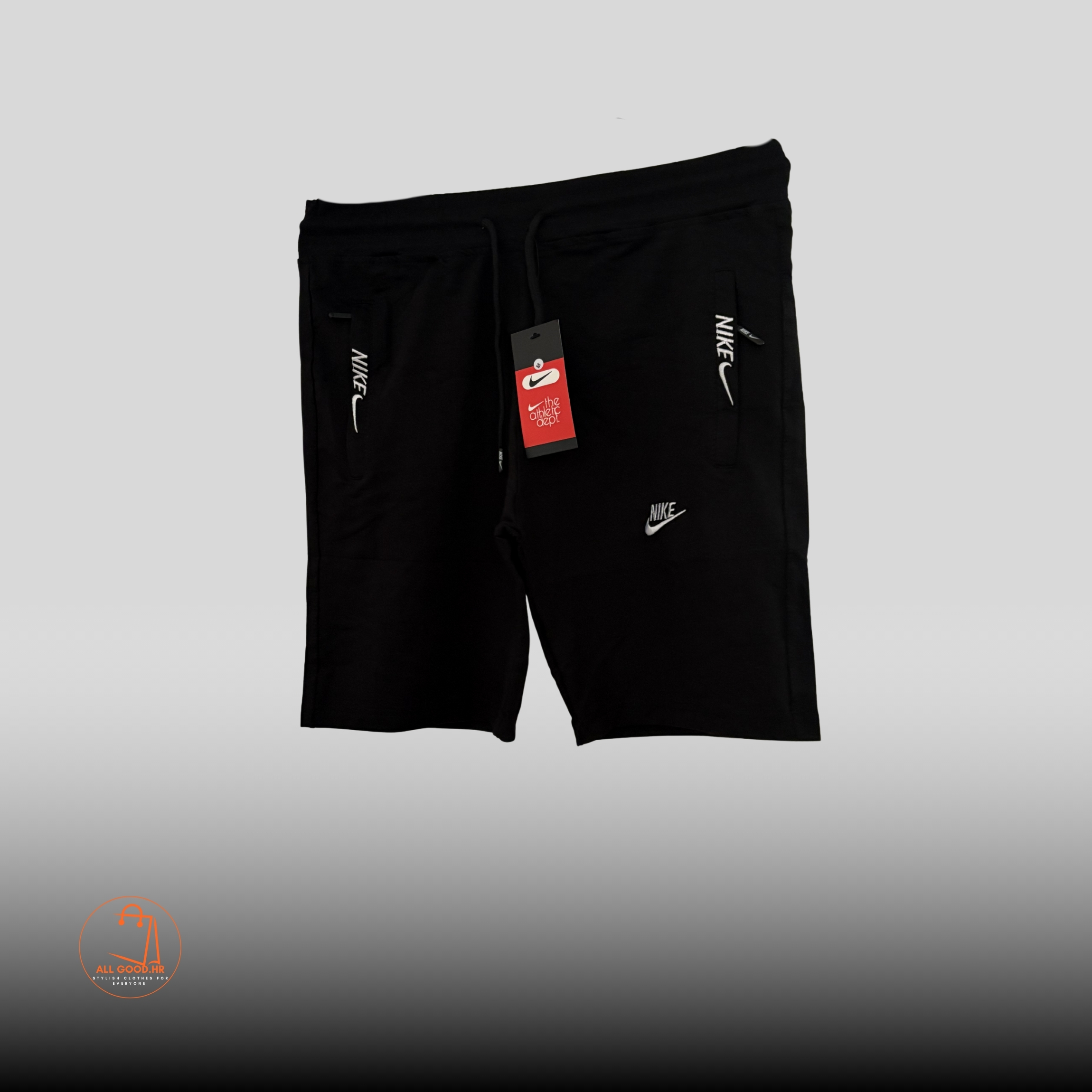 Muške Nike kratke hlače u klasičnoj crnoj boji s bijelim Nike logom. Dva bočna džepa s patentnim zatvaračima i vezicom u struku pružaju udobnost i funkcionalnost za svaki dan.