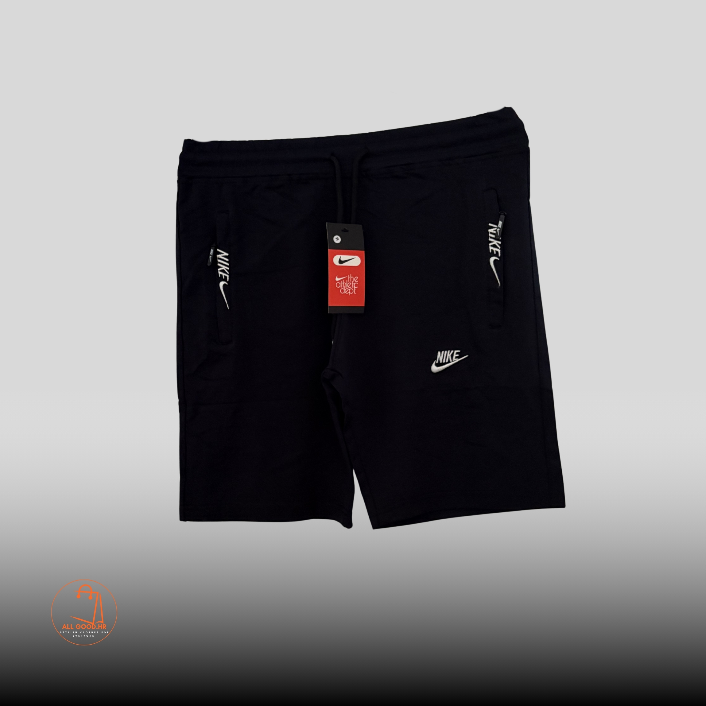 Klasične muške Nike kratke hlače u crnoj boji s više pozicioniranih bijelih logotipa. Elastični pojas i praktični džepovi s patentima idealni su za sportske i casual prilike.